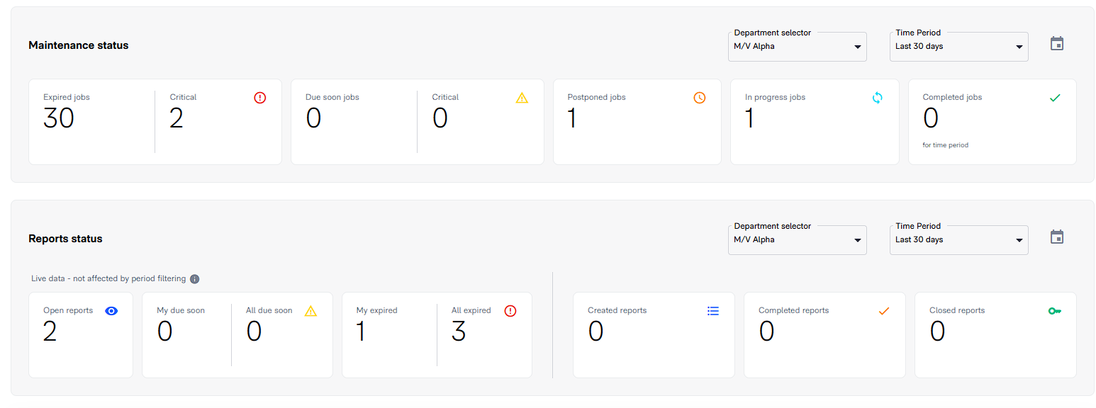 Maintenance Status: Summarizes maintenance workload into clear status categories (Expired, Due Soon, Critical, Postponed, In Progress, Completed) and specifically highlights Due Soon and Expired jobs involving critical components, enabling sharper onboard prioritization and earlier intervention before issues escalate into failures or non-compliance. This also speeds up daily follow-up by showing exactly where the workload is building.