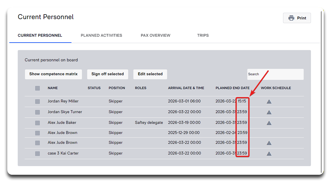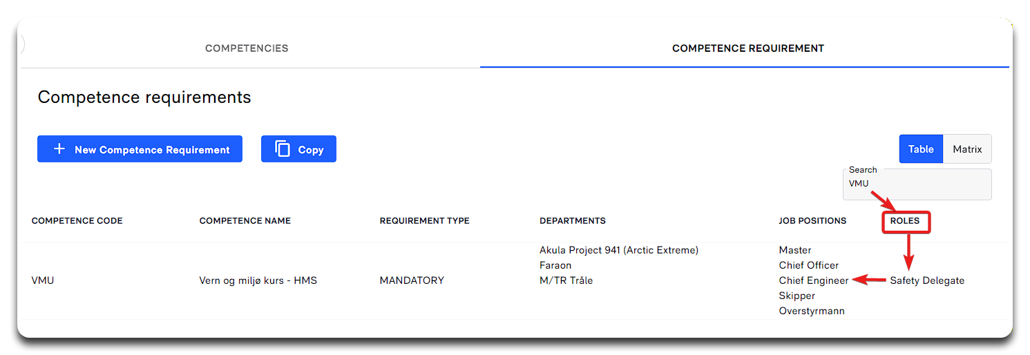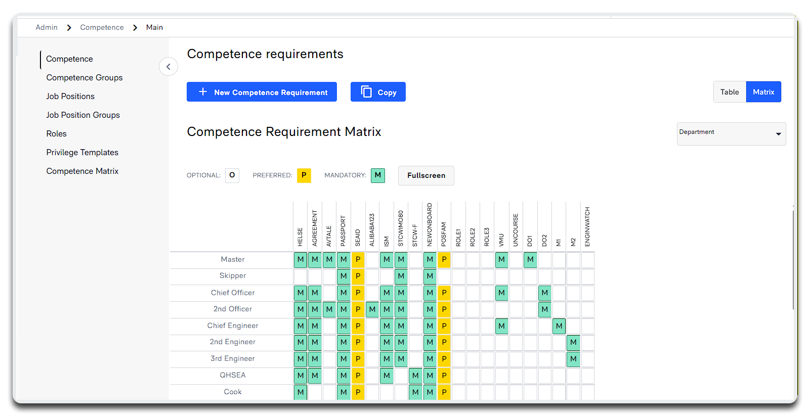 The matrix view provides a significantly better overview, especially for shipping companies with multiple vessels. Managers can choose which department to display in the matrix, making it easier to focus on relevant competence requirements across vessels and departments — a selection that is not available in the list view.