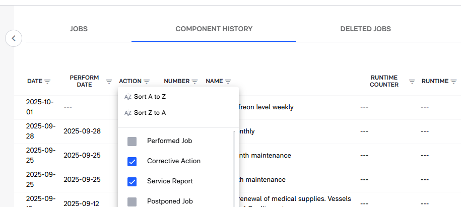 Vi har nå fått inn muligheten til å filtrere i komponenthistorikk fanen. Dette gjør det mye enklere å finne ting som tidligere er utført. Du kan nå legge inn filter på dato og forskjellige handlinger (korrektive jobber, servicerapporter, utsatte jobber og mer).